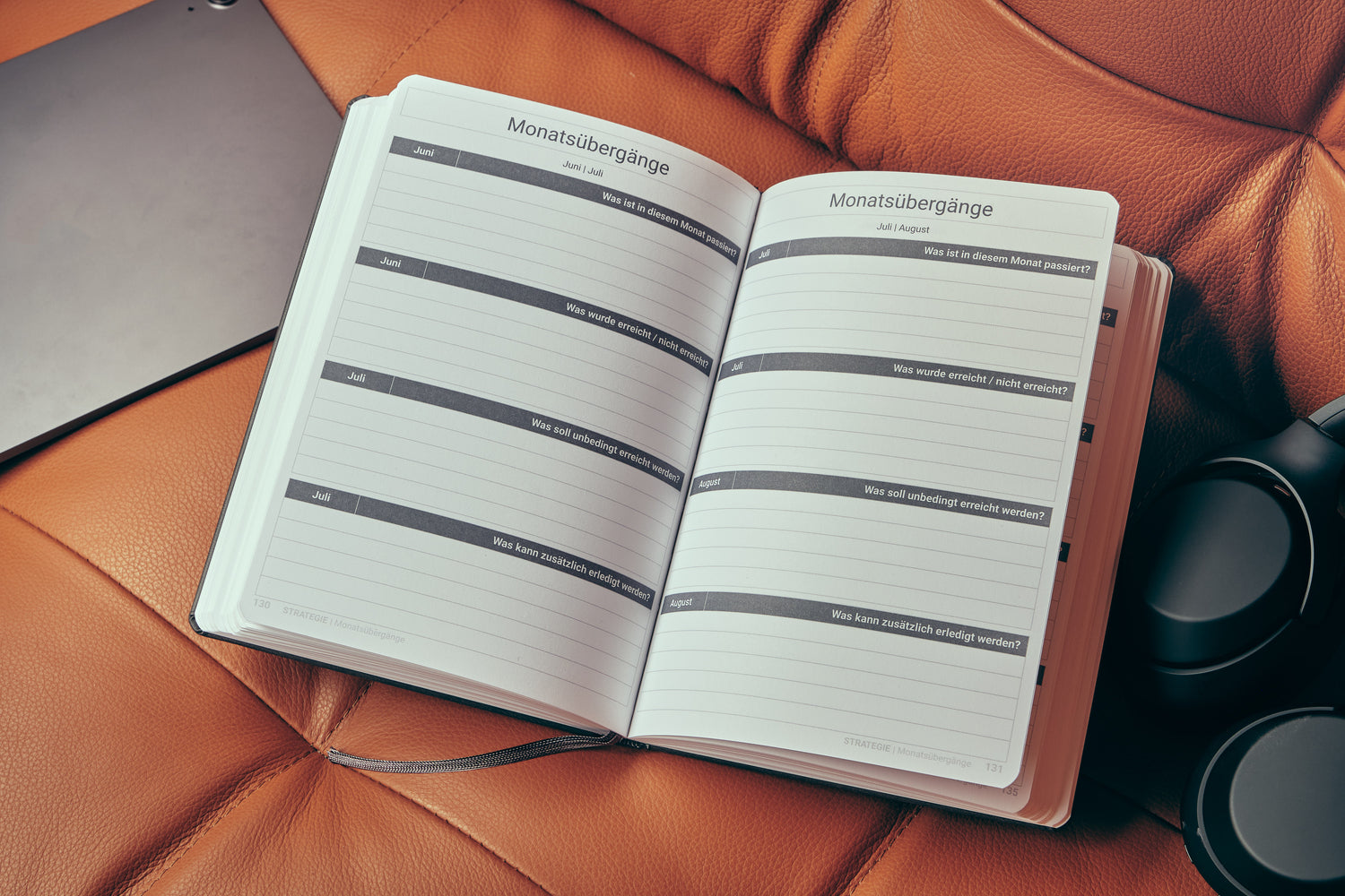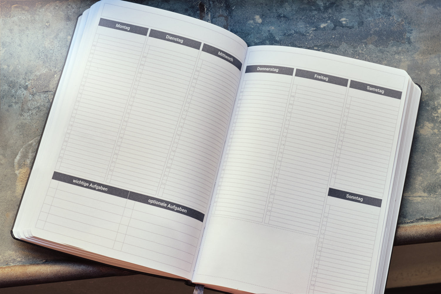 Jederzeit loslegen - Dank undatieren Wochenseiten. Lege Wochen- und Tagesthemen fest und notiere Termine und Aufgaben.